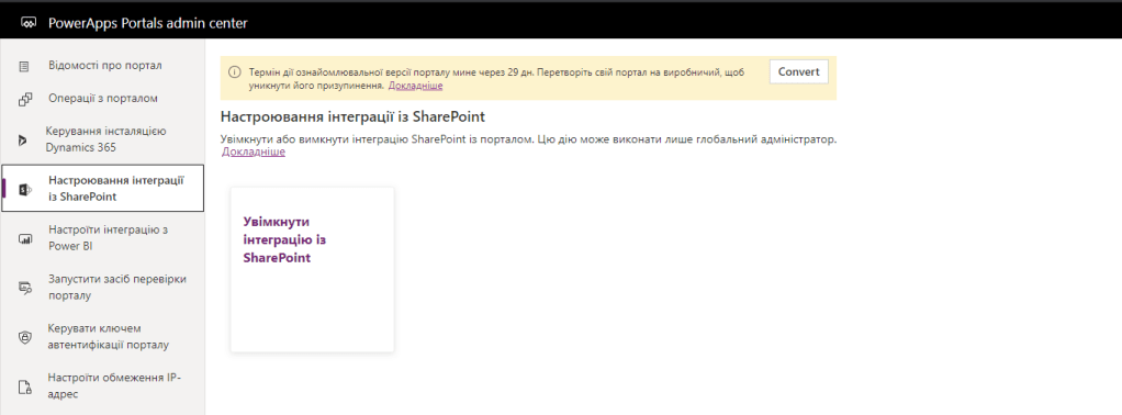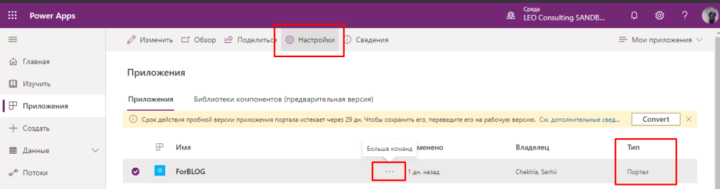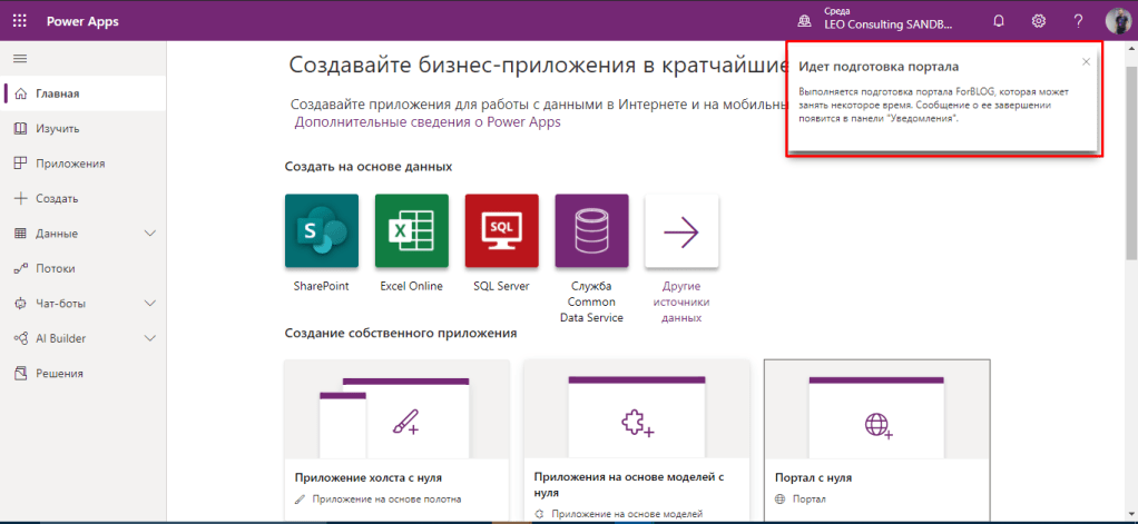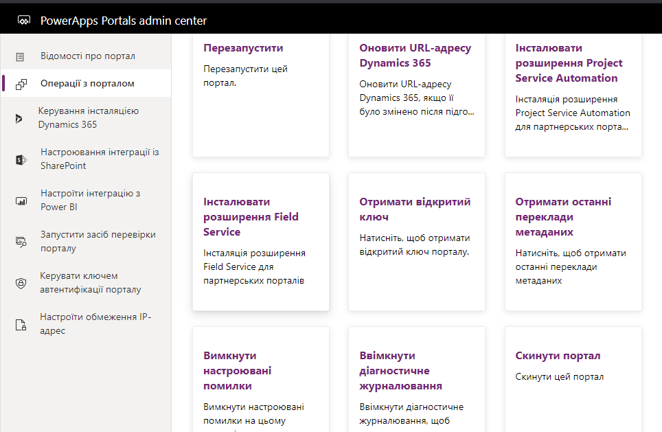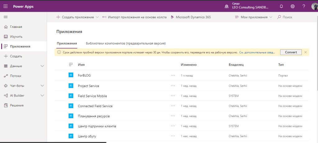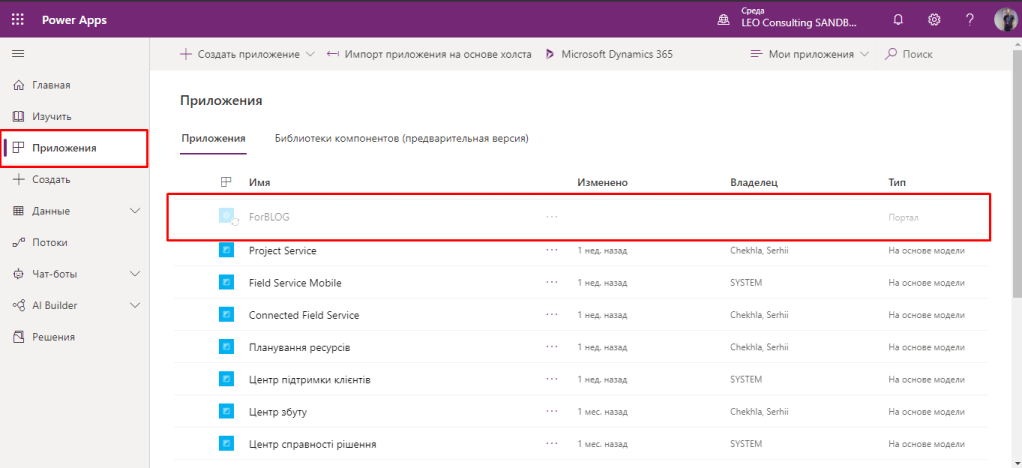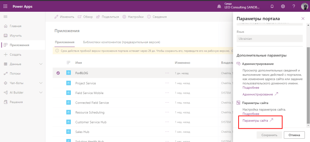 Перед нами відкривається PowerApps Portals admin center