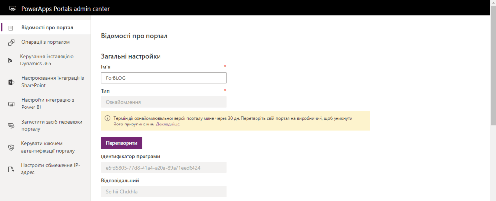 Які можливості ми маємо у вікні Відомостей про портал для налаштування: зміна імені порталу (що ніяк не вплине на url); конвертація порталу із пробного в робочий, про що ми говорили вище; змінити тип порталу на основі шаблонів; вимкнути портал або, по суті, призупинити його публікацію в інтернеті.