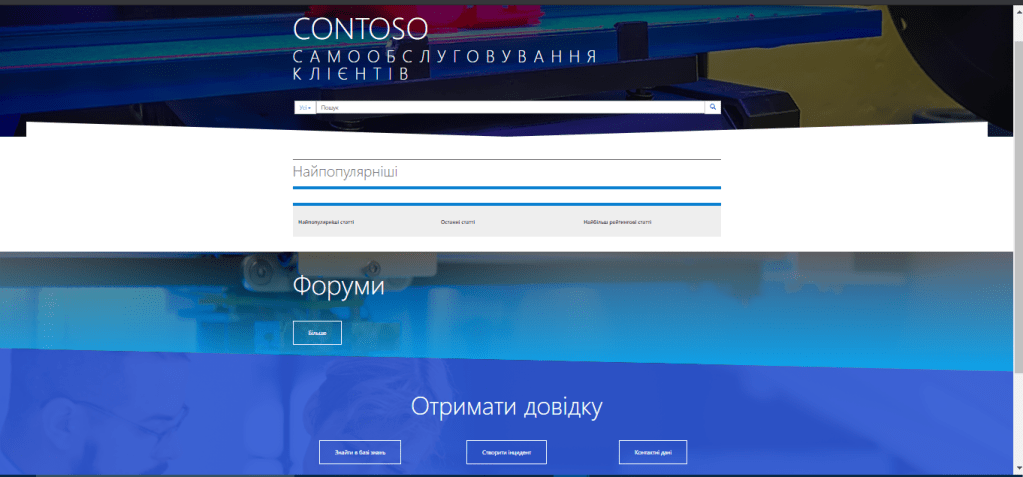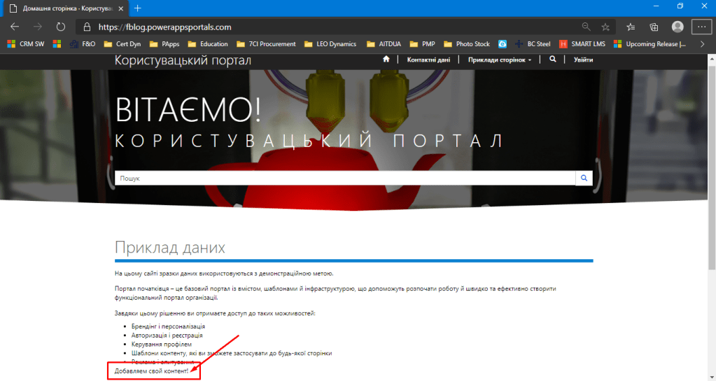 Отже клікаємо за назвою порталу і перед нами відкривається вже створений портал, обраною мною мовою і тут добре знати нюанс, що кількість доступних мов обмежена мовами встановленими в середовищі (змінити можна за адресою admin.powerplatform.com) в моєму випадку це українська і англійська.