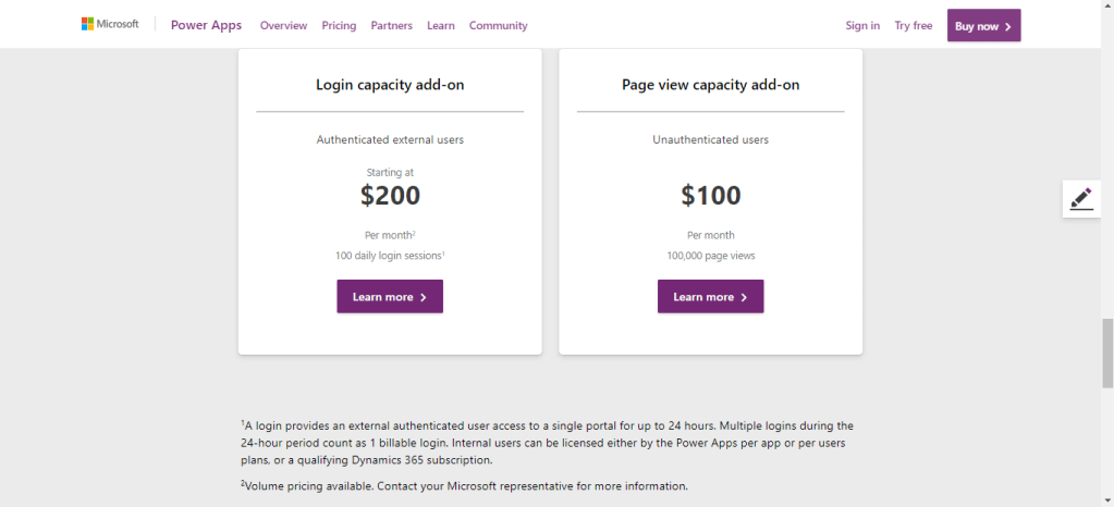Отже Портали включені в ліцензію або Dynamics 365 або PowerApps, користувачі з ліцензією за 10$ per user-per app, можуть скористатися лише 1 порталом, користувачі з 40$ ліцензією не обмежені у кількості порталів – підозрюю, що у майбутньому це може стати окремим типом ліцензій, зараз можна докупити кількість переглядів сторінок порталу зовнішніми користувачами.