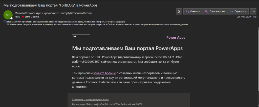 Виходячи з підказок у діалоговому вікні, бачимо, що портал це звичайний-незвичайний веб-сайт, розміщений у домені powerappsportals.com і фактично дані “лежать” на серверах Microsoft.