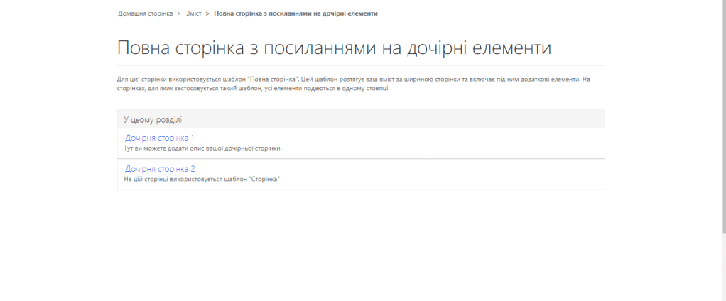 Коли створюємо портал першого типу, немає шаблонів і купи якихось опцій, просто створюється початковий портал у ньому є кілька сторінок для розуміння як виглядає їх дизайн, наприклад, у нашому порталі теж є така сторінка з дочірніми посиланнями.