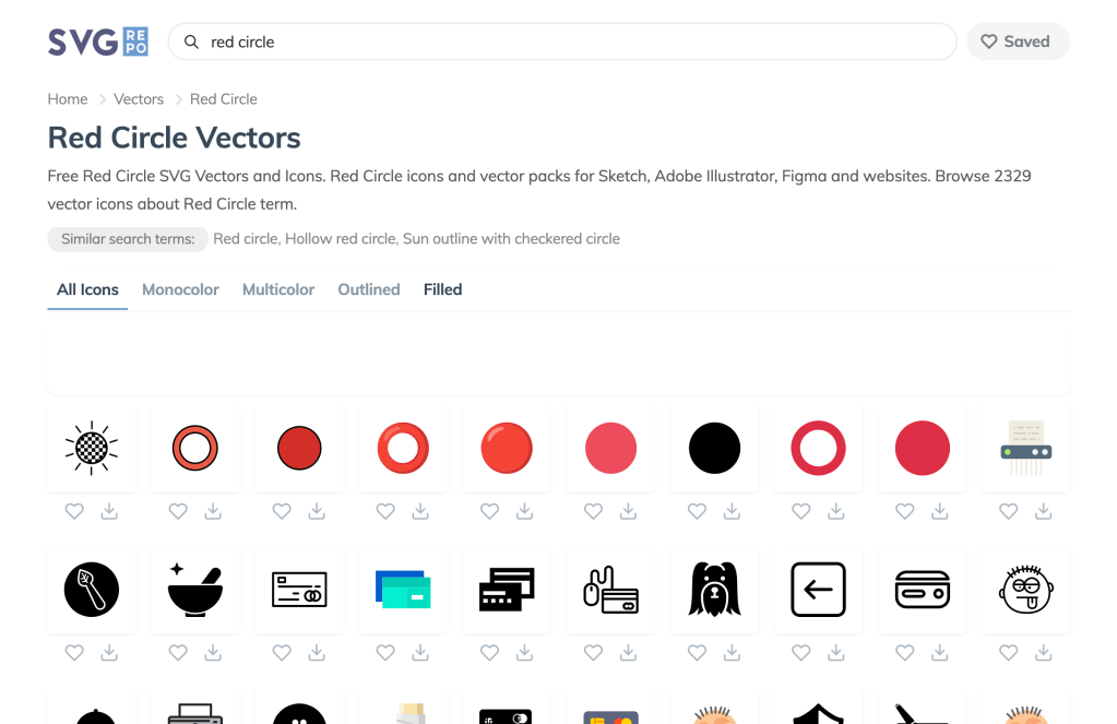 Перший крок, який нам необхідно зробити, це власне знайти іконки, бажано в форматі svg. Я рекомендую додати в Вибрані сайт https://www.svgrepo.com/, шукаємо потрібну нам іконку, написавши в пошуку наприклад “Red circle“.