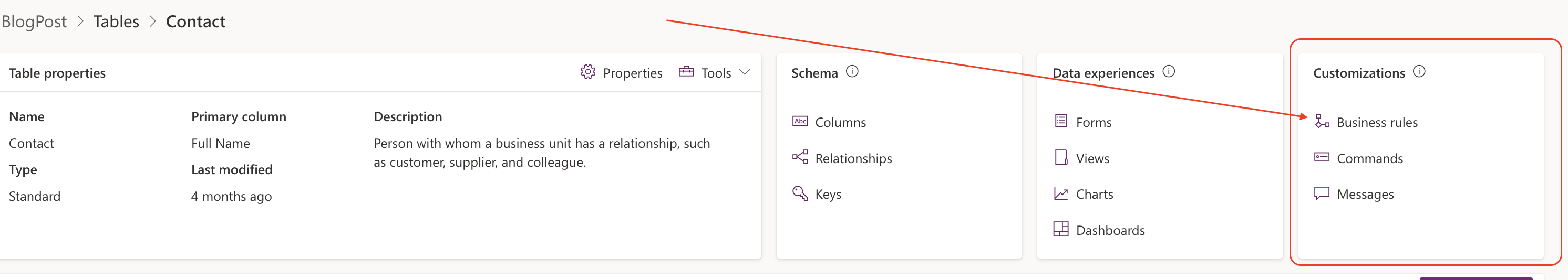 Перше, ми маємо з вами відкрити налаштування будь-якої таблиці в системі, оскільки бізнес правила – це частина блоку Customizations в таблицях Dataverse.